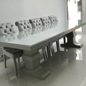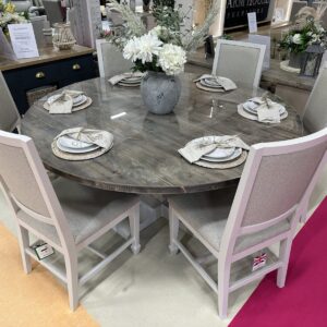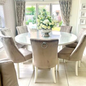 Large 1.8m Round Painted Bespoke Trestle Table with Perspex Top and 8 Mink Belvoir Dining Chairs