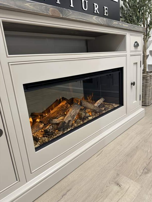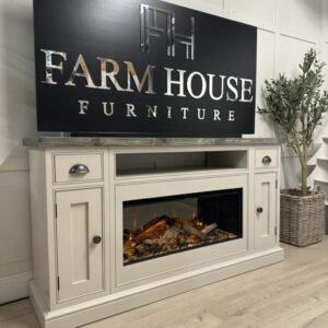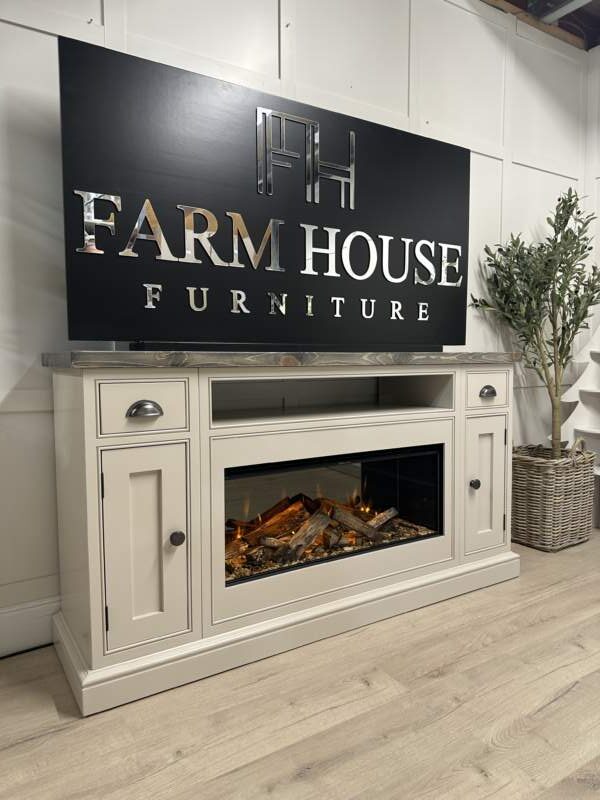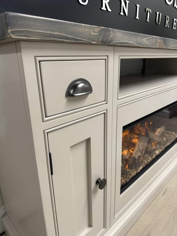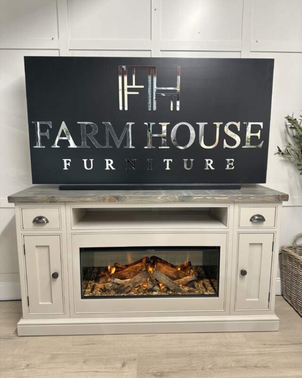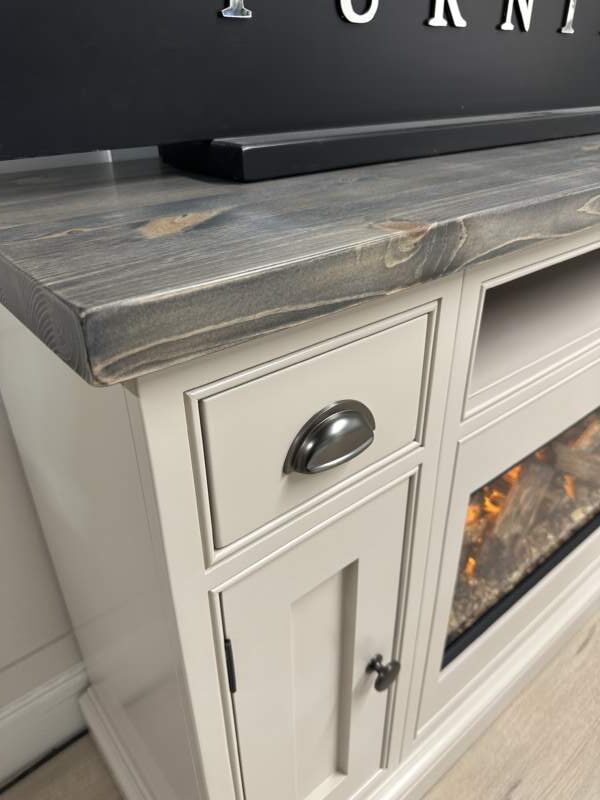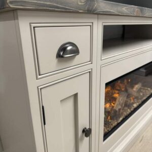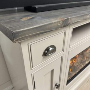 Introducing the epitome of luxury and innovation: Our NEW bespoke built TV media sideboards with integrated British fires. It’s not just a statement piece – it’s an experience. Transform your home into a haven of modern elegance and undeniable allure. The gorgeous example shown was finished in the timeless Farrow and Ball colour Elephants Breath which is complimented beautifully by our Distressed top and Pewter handles.