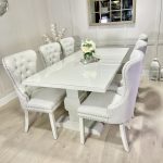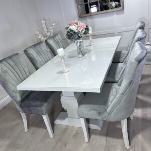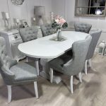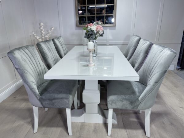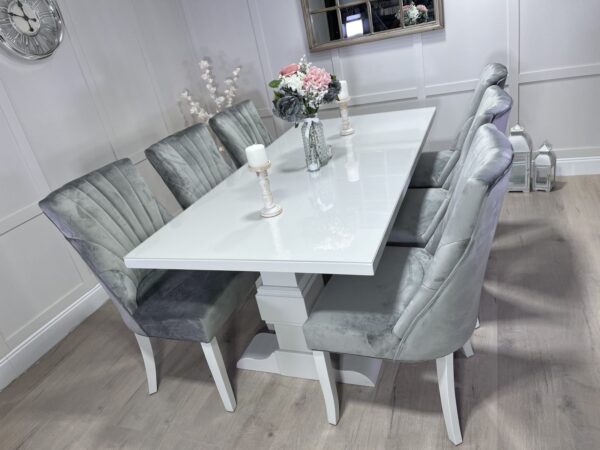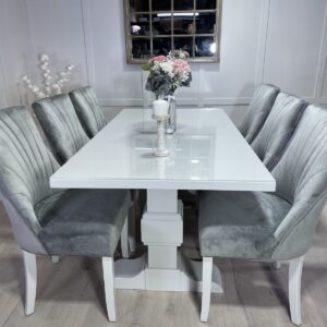 Introducing one of our Beautifully handcrafted bespoke trestle dining sets. Spray finished in the simply elegant farrow and ball colour Ammonite this set just oozys class!. This dining set also benefits from having 6 of our comfy light grey velvet belvoir fabric chairs and our 5mm thick clear perspex table top protector.