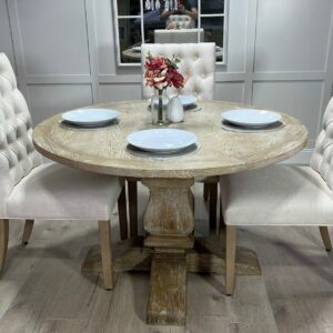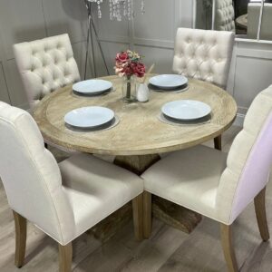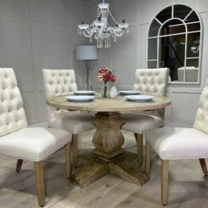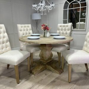 Be the first to review “120cm Round Limed Driftwood Trestle Table with 4 White Chesterfield Fabric Chairs”