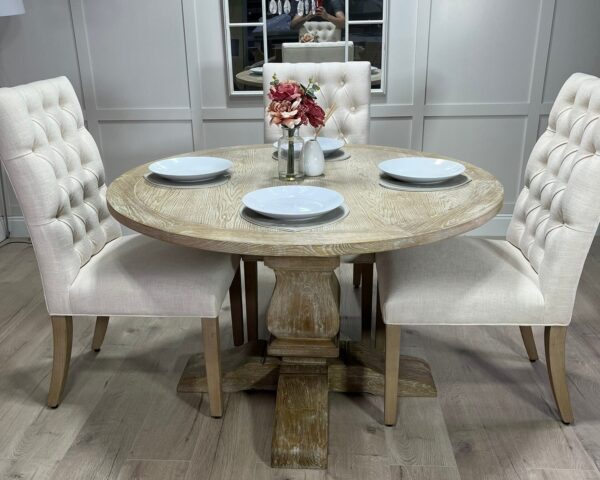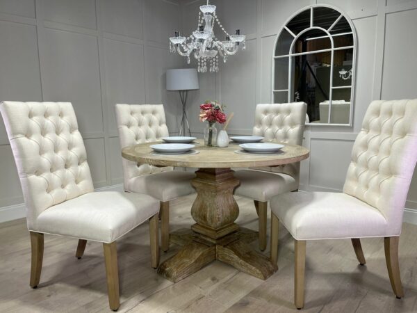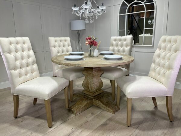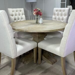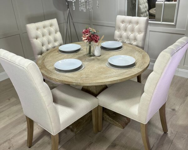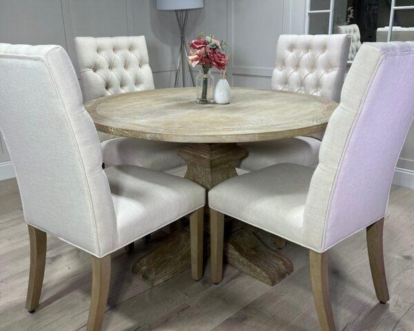 Introducing one of our beautifully handcrafted round trestle dining sets. This gorgeous example is finished in a timeless limed oak which against the distressed oak adds some real character and charm. This dining set also benefits from having 4 of our comfy deep button chesterfield fabric chairs .