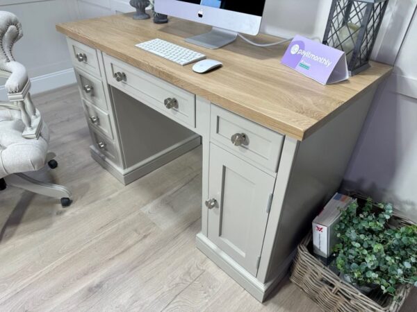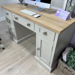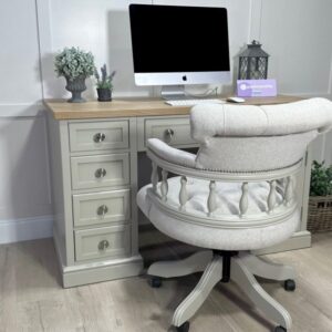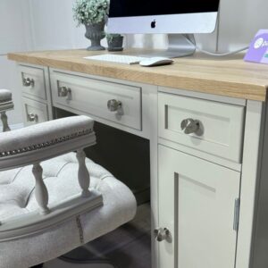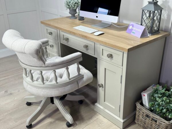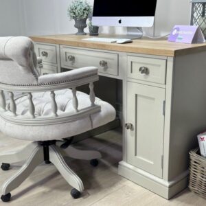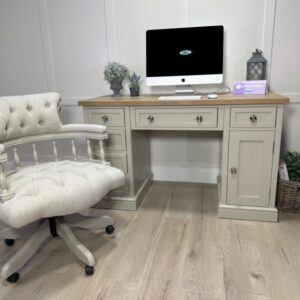 A stunning centerpiece for any sophisticated home office or workspace is our traditionally handcrafted 130cm shaker style desk offered here with our luxurious beige captains office chair. Made from a beautiful radiata knotless pine these desks are built to stand the test of time and arrive pretty much fully assembled. The considerable depth of this one helps maximize space for all your office needs making this desk perfect for those working from home. This gorgeous example was finished in gentle greige colour Drop Cloth which pairs beautifully with our light oak worktop and carefully chosen stainless steel handles.