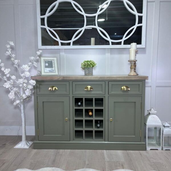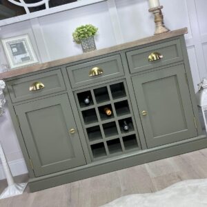 Introducing one of our traditionally handcrafted 130cm shaker sideboards. Made from a beautiful knot free radiata pine these units are built to last a lifetime. We have chosen to finish this gorgeous example in the exquisite dark green colour F&B Treron which pairs beautifully with our Distressed worktop. A central wine rack completes this classic and versitile timeless peice.