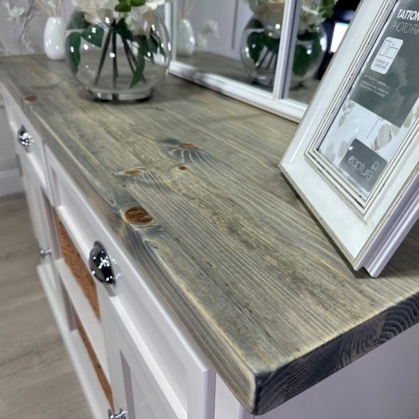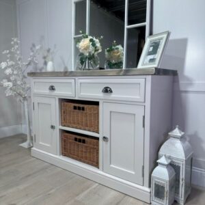 Introducing one of our traditionally handcrafted 130cm shaker sideboards. Made from a beautiful knot free radiata pine these units are built to last a lifetime. We have chosen to finish this gorgeous example in the cotemporary neutral skimming stone which pairs beautifully with our Distressed worktop. The wicker baskets provided complete this quite stunning timeless piece.