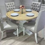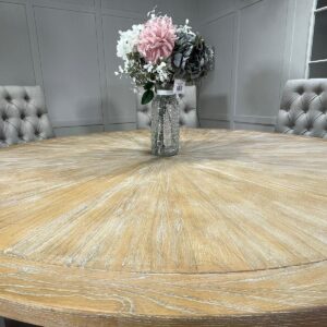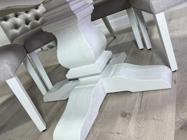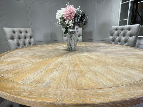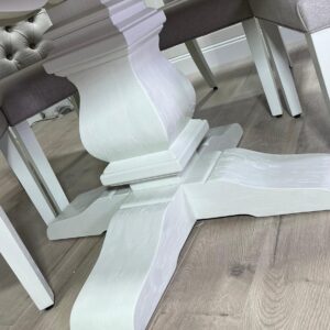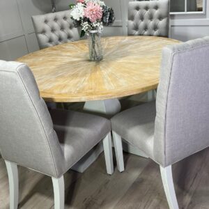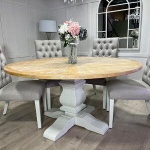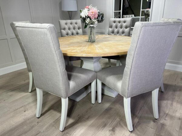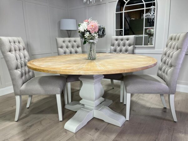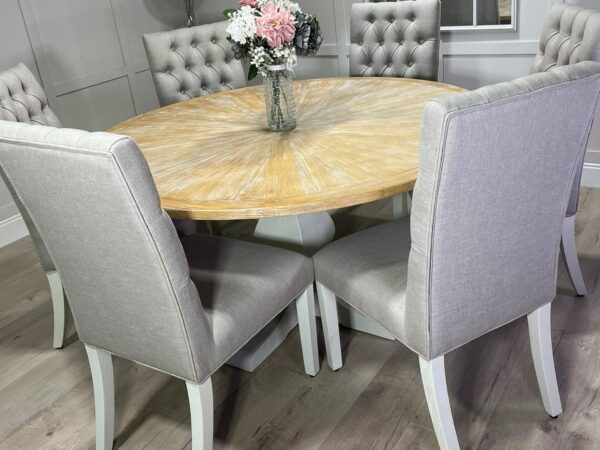 Introducing one of our beautifully handcrafted round trestle dining sets. This gorgeous example was finished in our very own timeless colour farmhouse white which pairs beautifully with our whitewash oak top. This dining set also benefits from having 6 of our comfy deep button chesterfield fabric chairs . (Should you prefer a different colour to the one shown please see our dining room collection which will allow you to order one in your specific paint and top colour)