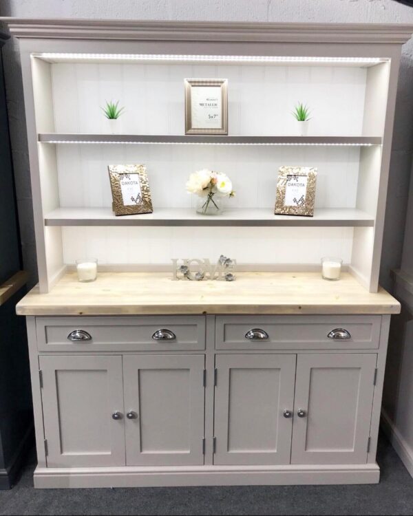 Introducing one of our traditionally handcrafted 150cm shaker display dressers complete with led strip lighting. Made from a beautiful knotless radiata pine these units are built to last a lifetime. We have chosen to finish this gorgeous example in the warm and contemporary colour Elephants breath.