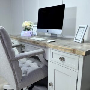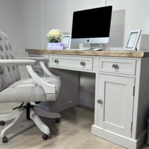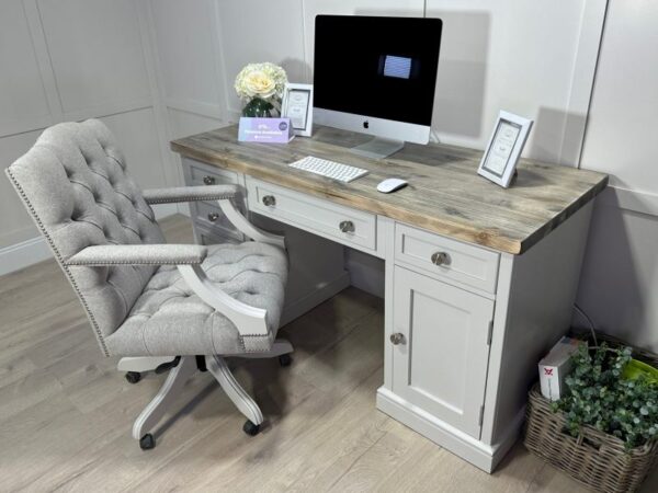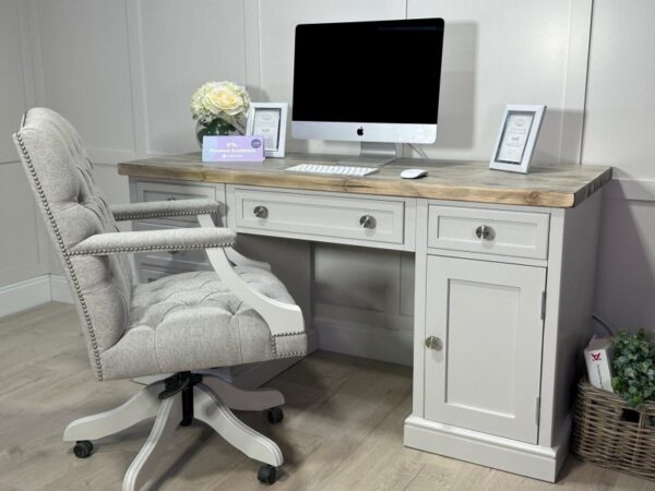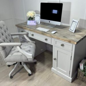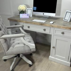 A stunning centerpiece for any sophisticated home office or workspace is our traditionally handcrafted 150cm shaker style desk offered here with our luxurious mink executive office chair. Made from a beautiful radiata knotless pine these desks are built to stand the test of time and arrive pretty much fully assembled. The considerable depth of this one helps maximize space for all your office needs making this desk perfect for those working from home. This gorgeous example was finished in gentle grey colour Ammonite which pairs beautifully with our Distressed worktop and carefully chosen stainless steel handles.