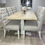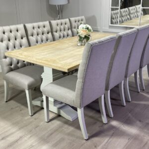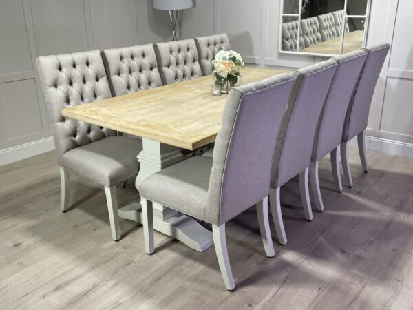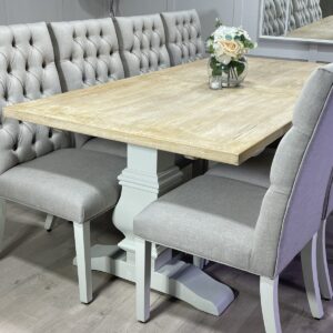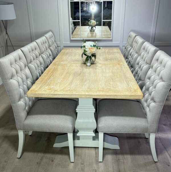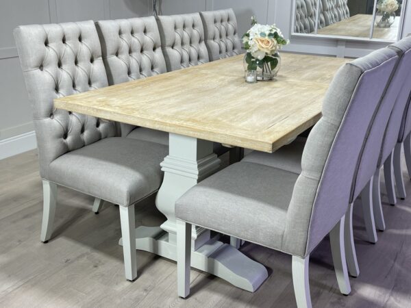 Introducing one of our beautifully handcrafted bespoke trestle dining sets. This gorgeous example was finished in our very own timeless colour farmhouse white which pairs beautifully with our whitewash oak top. This dining set also benefits from having 8 of our comfy deep button chesterfield fabric chairs . (Should you prefer a different colour to the one shown please see our dining room collection which will allow you to order one in your specific paint and top colour)