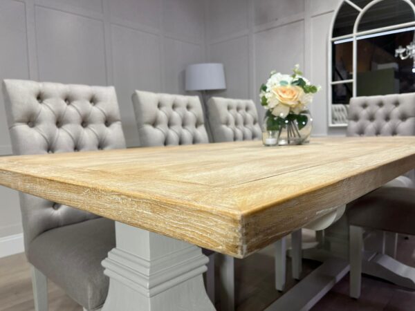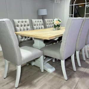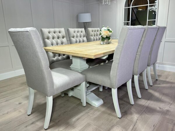 2m Whitewash Oak Trestle Table with 8 Grey Chesterfield Fabric Chairs – Farmhouse White