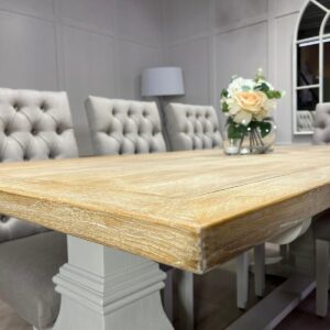Be the first to review “2m Whitewash Oak Trestle Table with 8 Grey Chesterfield Fabric Chairs – Farmhouse White”