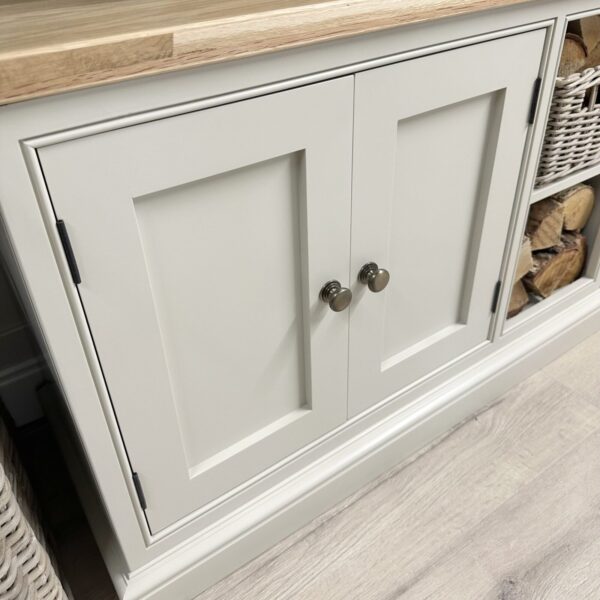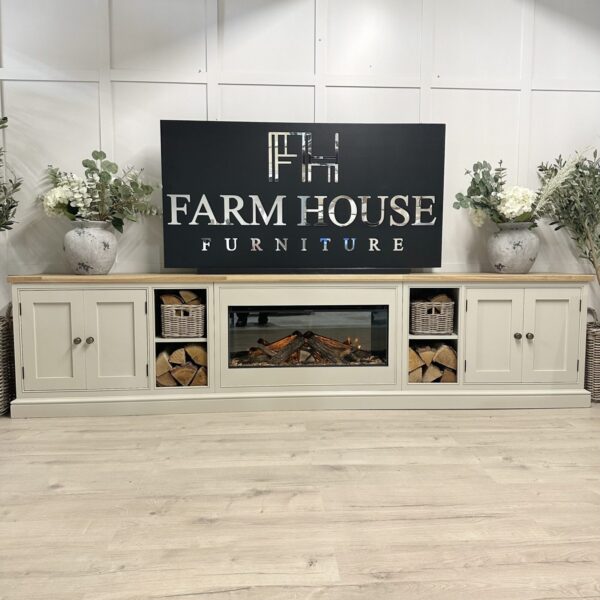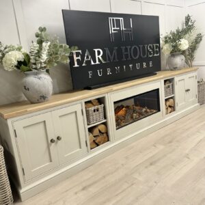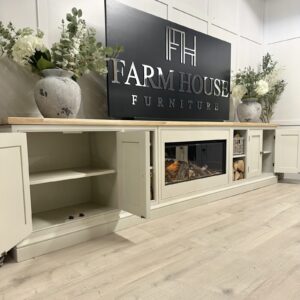 Introducing the epitome of luxury and innovation: Our NEW bespoke built TV stands with integrated British fires. It’s not just a statement piece – it’s an experience. Transform your home into a haven of modern elegance and undeniable allure. The gorgeous example shown was finished in the timeless Farrow and Ball Drop Cloth which pairs beautifully with our Light Oak worktop.