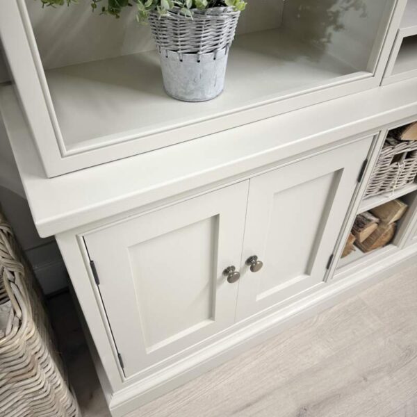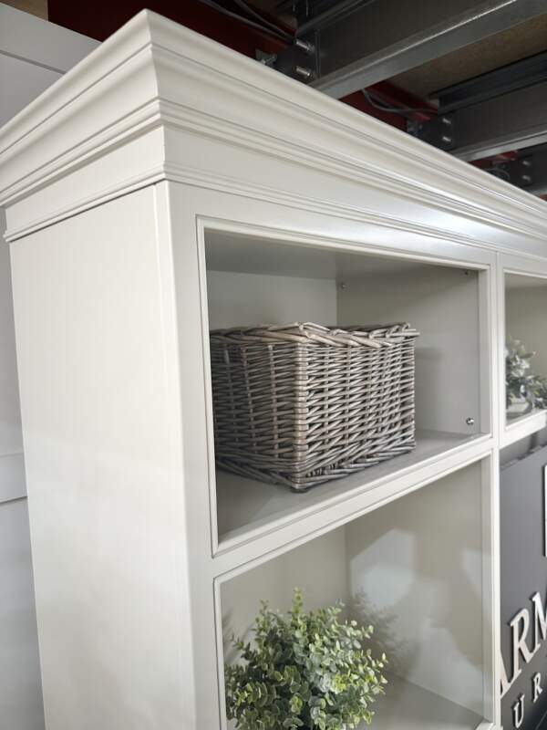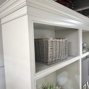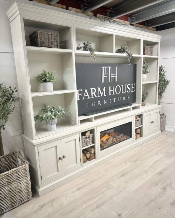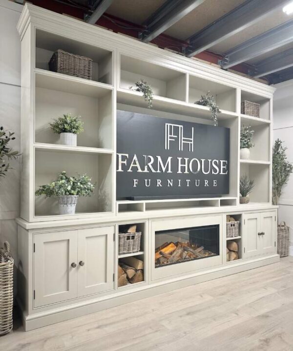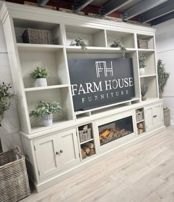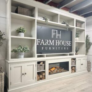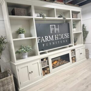The central gap includes a large cutout for cables and is designed to house a 65” TV. The gorgeous example shown was spray matched in the timeless Farrow and Ball colour Ammonite .