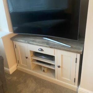 Introducing one of our traditionally handcrafted 4ft Shaker TV stands. Made from a beautiful knotless radiata pine these units are built to last a lifetime. The gorgeous example shown is finished in the gentle ivory colour Ball white which pairs beautifully with our Distressed worktop.