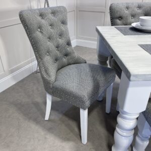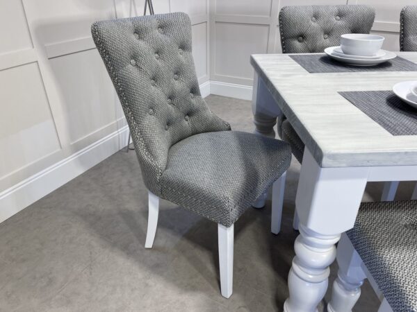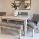 Beautifully handcrafted chunky farmhouse table offered with 2 of our elegant mixed grey windsor chairs, 2 of our tall painted ladder back chairs and a matching tuckaway bench. The colour shown on this product is Ammonite with our smooth and gorgeous 40mm thick Grey wash top. The finish comes with several layers of laquar and wax to cope with all the hustle and bustle that a farmhouse table should.