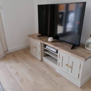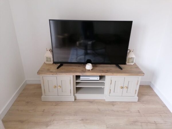 Introducing one of our traditionally handcrafted 5ft Farmhouse TV stands. We have chosen to finish this one in the gorgeous greige colour Drop cloth which pairs beautifully with our Distressed worktop.