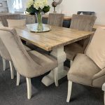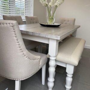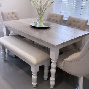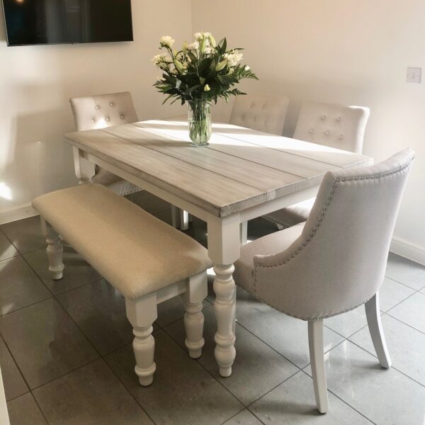 Take a peak at this beautifully crafted farmhouse dining set offered here with 4 of our plain beige winchester fabric chairs and a matching fabric bench. This gorgeous example is finished in the timeless colour Ammonite which pairs beautifully with our 40mm thick White wash top. This finish is coated with several layers of laquar and wax to cope with all the hustle and bustle that a farmhouse table should.
