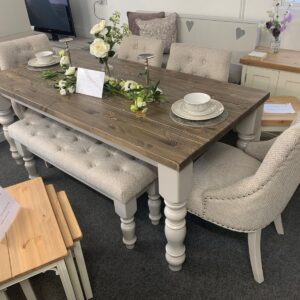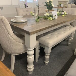 Be the first to review “6ft Chunky Farmhouse Table with 4 Mixed Beige Winchester Chairs & 1 Fabric Bench”