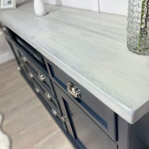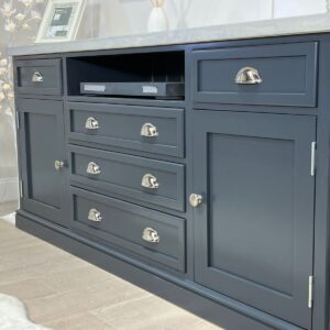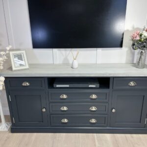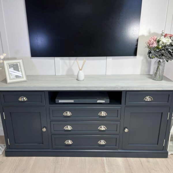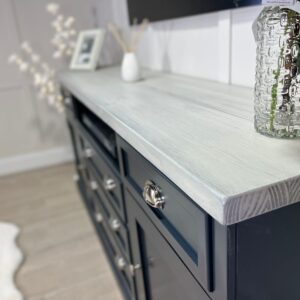 Introducing one of our traditionally handcrafted 6ft Classic TV Sideboards. Made taller than most these are perfect for placing under wall mounted TVs. We have chosen to finish this gorgeous example in the striking Railings which is beautifully complimented by our Grey Wash worktop.