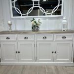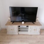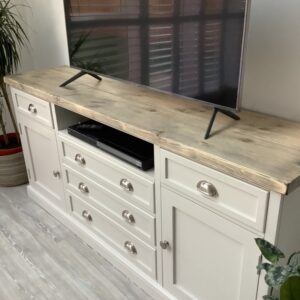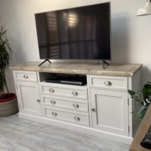 Introducing one of our traditionally handcrafted 1.8m Classic tall tv sideboards. Made taller than most these are perfect for placing under wall mounted TVs. Perfect for a neutral space the gorgeous example shown is finished in the timeless F&B colour Ammonite which pairs beautifully with our Distressed worktop. For a more striking appearance we have also included in the photo gallery a version finished in Railings which is beautifully complimented by our Medium worktop.