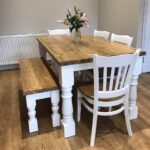 Beautifully crafted farmhouse table is offered here with 3 of our gently curved Ladder Back chairs and a matching tuck away bench. The colour shown on this product is the classic all white which pairs beautifully with Grey wash top. The finished surface comes with several layers of laquar and wax to cope with all the hustle and bustle that a farmhouse table should.