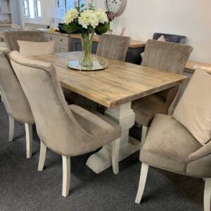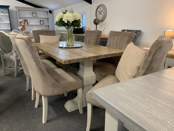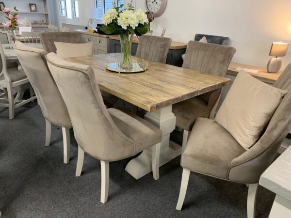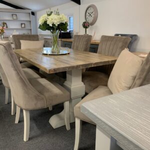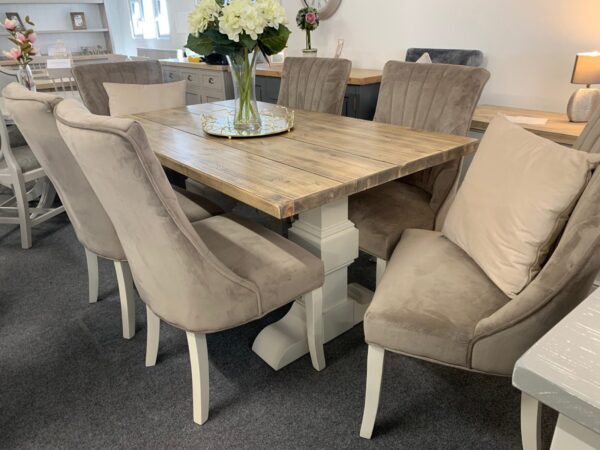 Introducing one of our Beautifully handcrafted bespoke trestle dining sets. We have chosen to finish this gorgeous example in the timeless colour Ammonite which pairs beautifully with our Distressed worktop. This dining set also benefits from having 6 of our comfy mink belvoir fabric chairs which finish this set off perfectly. An optional clear perspex table top protector is also available on request so please contact us directly after ordering should you wish to add this option to your order.