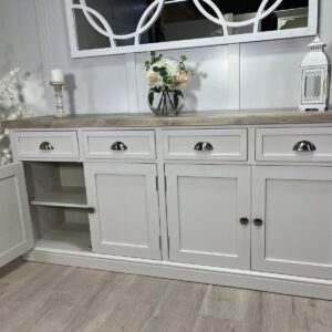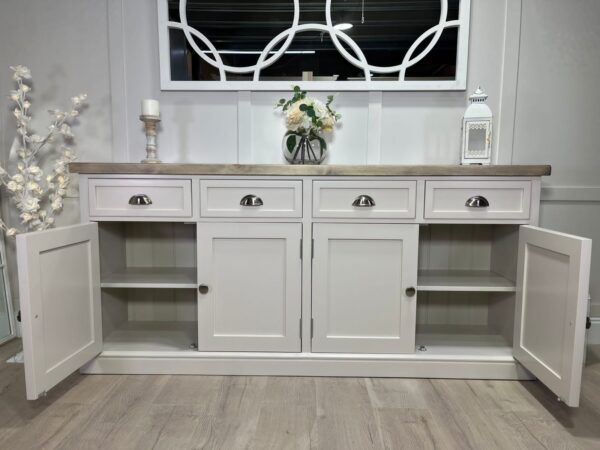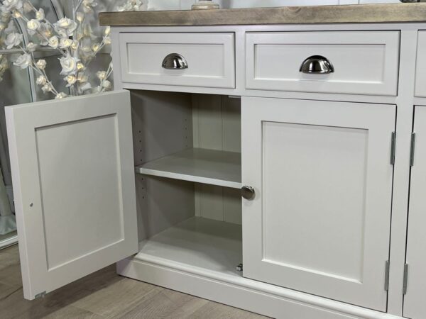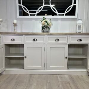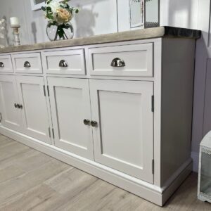 Introducing one of our traditionally handcrafted 1.8m shaker sideboards. Made from a beautiful knotless radiata pine these units are built to last a lifetime. We have chosen to finish this gorgeous example in the contemporary neutral F&B colour Skimming stone which pairs beautifully with our Distressed worktop.