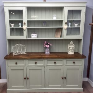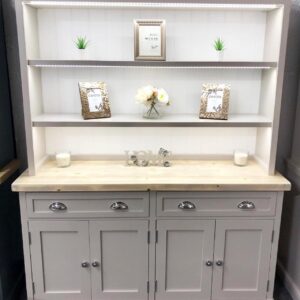 Beautifully crafted chunky farmhouse dining set with 5 of our mixed grey winchester chairs and a matching fabric button bench. The Finish shown on this product is in farrow and ball Ammonite with our Grey Wash 40mm thick pine top. This finish is coated with several layers of laquar and wax to cope with all the hustle and bustle that a farmhouse table should.