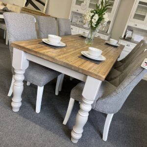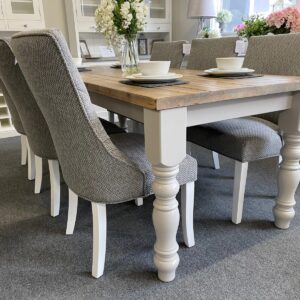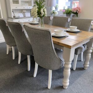 Be the first to review “7ft Chunky Farmhouse Table with 6 Mixed Grey Belvoir Fabric Chairs”