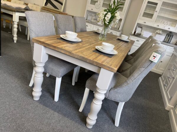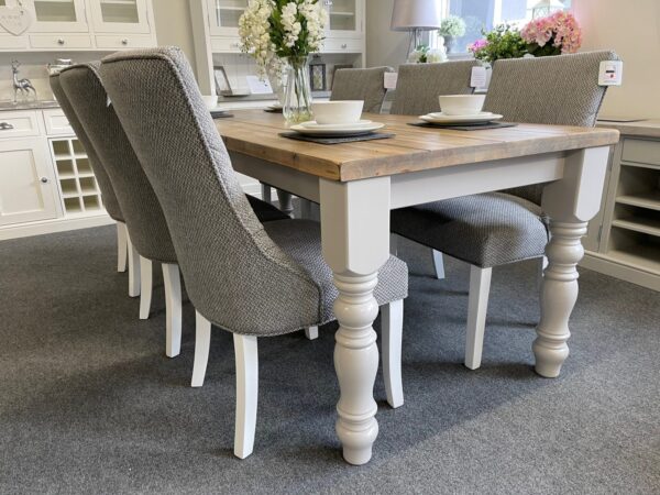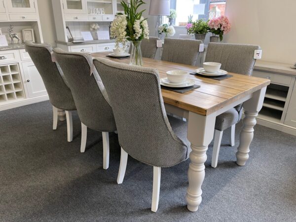 Introducing one of our Beautifully handcrafted farmhouse dining sets. Spray finished in the simply timeless farrow and ball colour Ammonite and complimented by our distressed top this set just oozys class!. This dining set also benefits from having 6 of our comfy mixed grey belvoir fabric chairs to complete one of our most elegant dining sets.