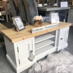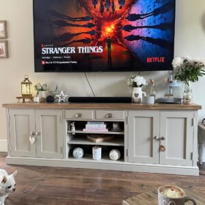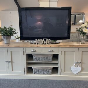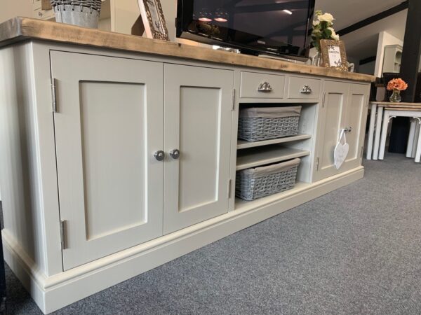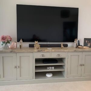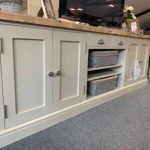 Introducing one of our traditionally handcrafted 7ft Shaker TV stands. Made from a beautiful knotless radiata pine these units are built to last a lifetime. We have chosen to finish this gorgeous example in the perfectly toned mid-greige colour Drop Cloth which pairs beautifully with our Distressed worktop.