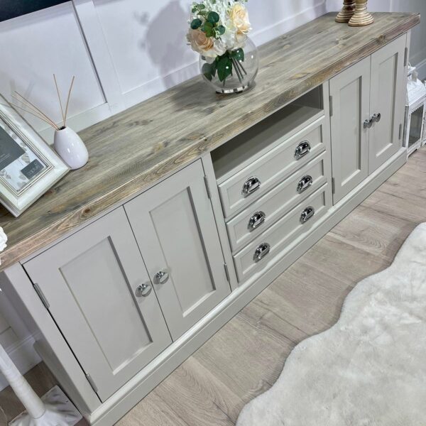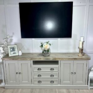 Introducing one of our traditionally handcrafted 6ft Classic TV stands . Made from a gorgeous radiata knot free pine these units are built to last a lifetime. The main image showcases the amazing greige colour Drop Cloth which pairs beautifully with our Distressed worktop.
