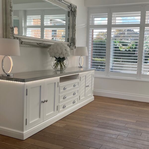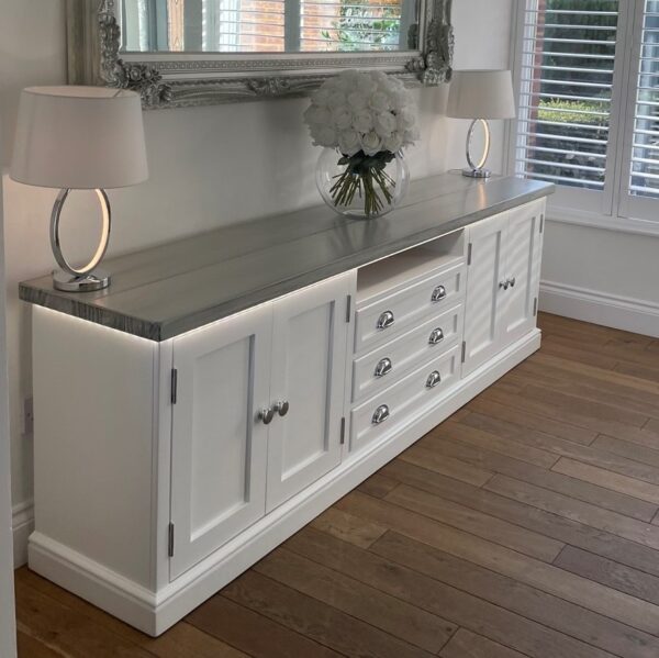 Introducing one of our traditionally handcrafted 7ft TV stands with LED Lighting. Made from a gorgeous radiata knotless pine these units are built to last a lifetime. The main unit showcased here is painted in the timeless farrow and ball colour All white which pairs beautifully with our Grey wash worktop.