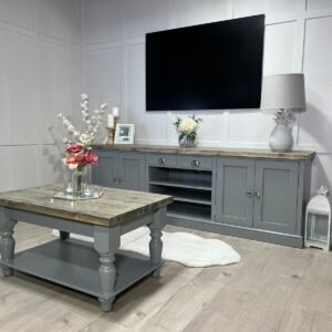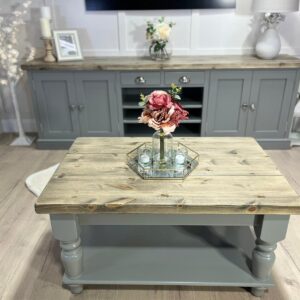 Introducing one of our traditionally handcrafted farmhouse Coffee tables. We have chosen to finish this gorgeous example in the perfectly toned mid-grey colour Manor house grey which pairs beautifully with our Distressed worktop.