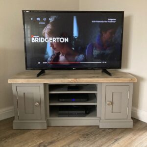 Introducing one of our traditionally handcrafted 4ft Farmhouse Corner TV stands. Made from a beautiful knotless radiata pine these units are built to last a lifetime. We have chosen to finish this gorgeous example in the perfectly toned mid-grey F&B colour Moles Breath which pairs beautifully with our Distressed worktop.