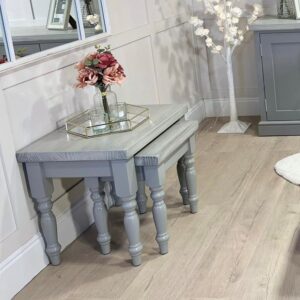 Introducing our beautifully handcrafted farmhouse Nest of tables. We have chosen to finish this gorgeous example in the perfectly toned mid-grey colour Manor house grey which pairs beautifully with our Grey wash worktop.