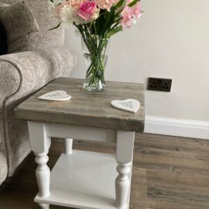 Beautifully handcrafted farmhouse Side table made from completely solid pine. Finish shown on the main picture is the gorgeous pairing of Ammonite and our Distressed top.