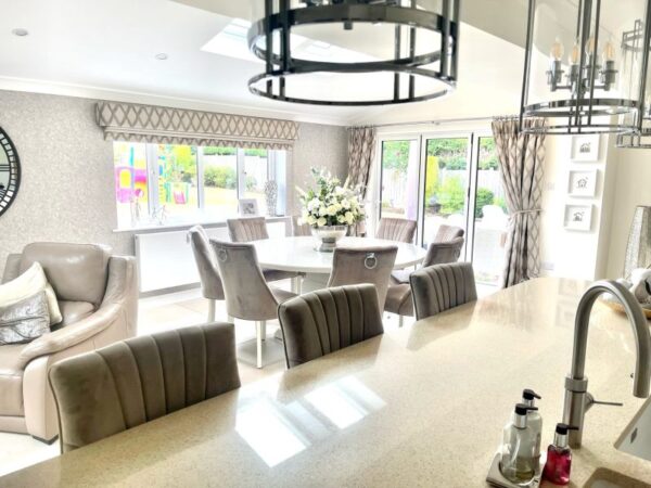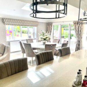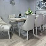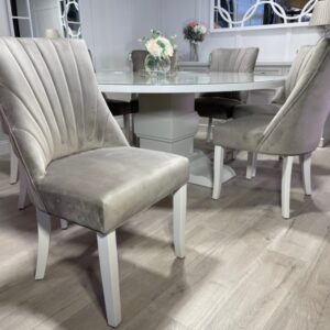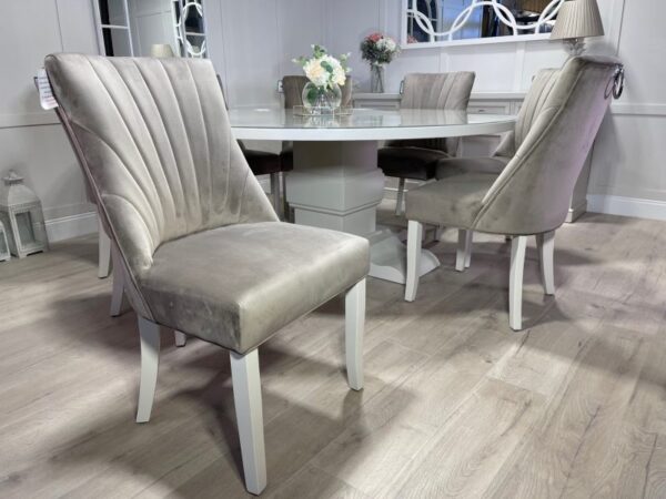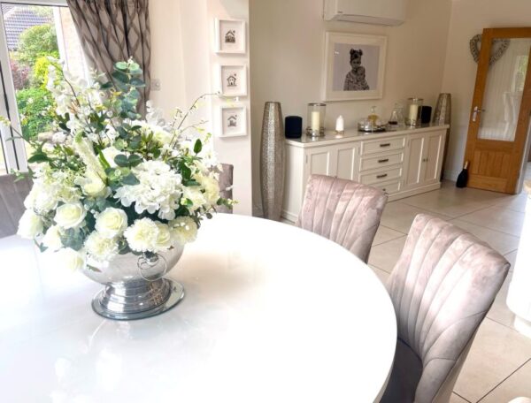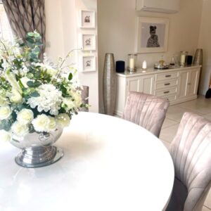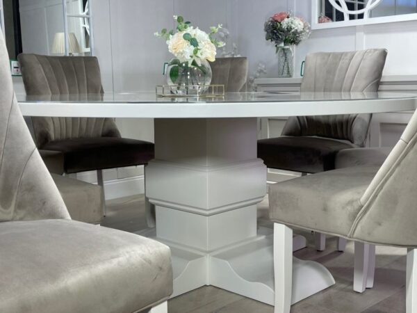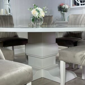 Be the first to review “Large 1.8m Round Painted Bespoke Trestle Table with Perspex Top and 8 Mink Belvoir Dining Chairs”