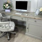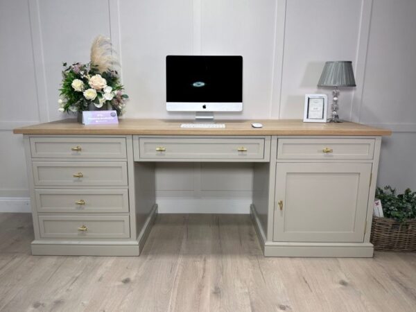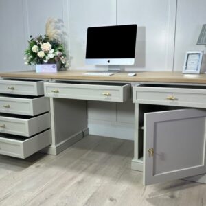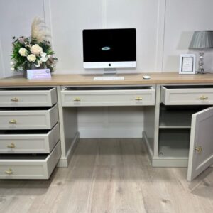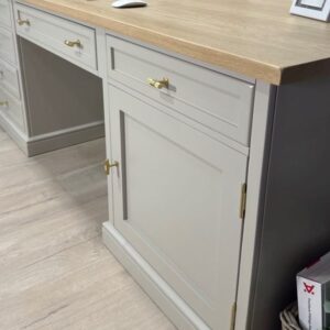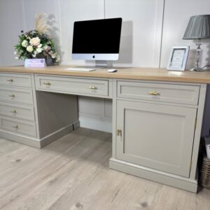 A stunning centerpiece for any sophisticated home office or workspace is our traditionally handcrafted 210cm shaker style desk. Made from a beautiful radiata knotless pine these desks are built to stand the test of time and arrive pretty much fully assembled. The considerable depth of this one helps maximize space for all your office needs making this desk perfect for those working from home. This gorgeous example was finished in gentle greige colour Drop Cloth which pairs beautifully with our Light Oak worktop and carefully chosen Gold T bar brass handles.