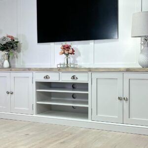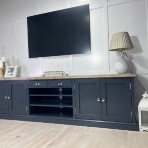 Introducing one of our traditionally handcrafted 2.4m Shaker TV stands. Made from a gorgeous radiata knot free pine these units are built to last a lifetime. The main image showcases the amazing architectural colour Pavilion Grey which pairs beautifully with our Distressed worktop. The other 2 images represent the colours Ammonite and Railings.