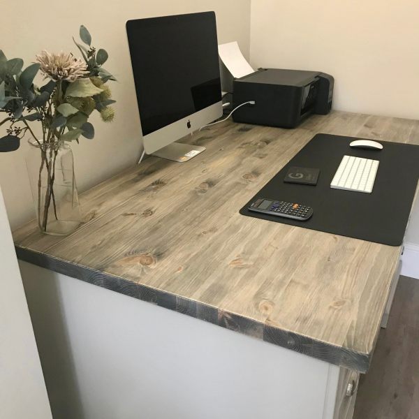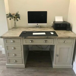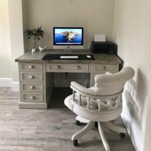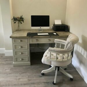 Introducing one of our traditionally handcrafted shaker style desks offered here with our luxurious captains office chair. Made from a beautiful radiata knotless pine these units are built to stand the test of time and arrive pretty much fully assembled. The considerable depth of this one helps maximize space for all your office needs making this desk perfect for those working from home. This gorgeous example was finished in gentle greige colour Drop cloth which pairs beautifully with our Distressed worktop.