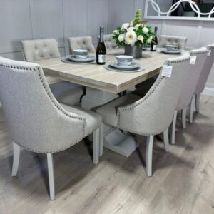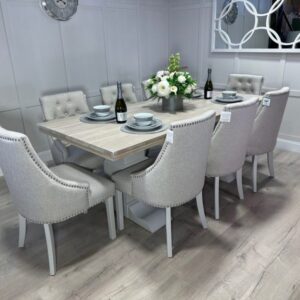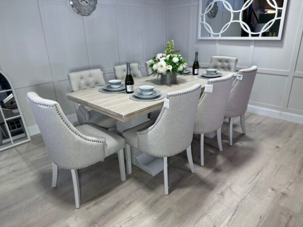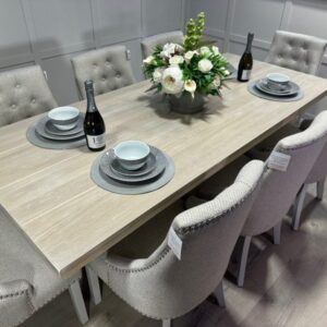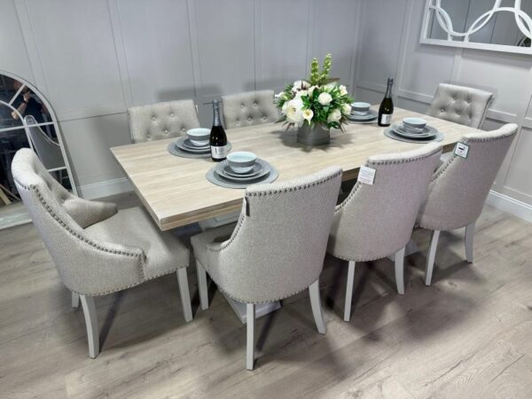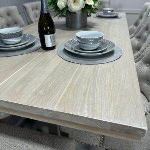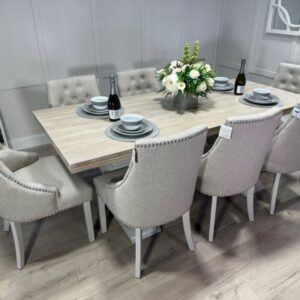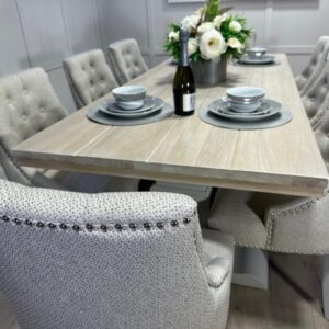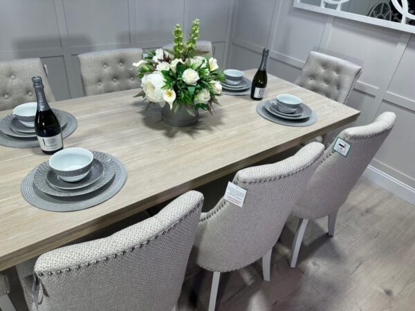 The solid oak table top will be finished with a limed effect leaving the gorgeous natural wood colour showing through. We then apply several coats of a hard water based laquar to protect your table for years to come. This dining set also benefits from having 8 of our comfy mixed beige winchester fabric chairs which finish this set off perfectly.