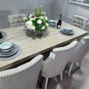 Be the first to review “Limed Oak 7ft Bespoke Trestle Table with 8 Mixed Beige Winchester Fabric Chairs”