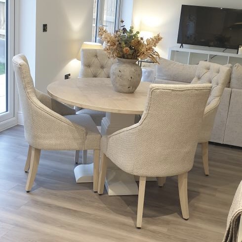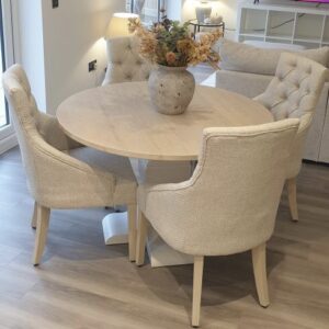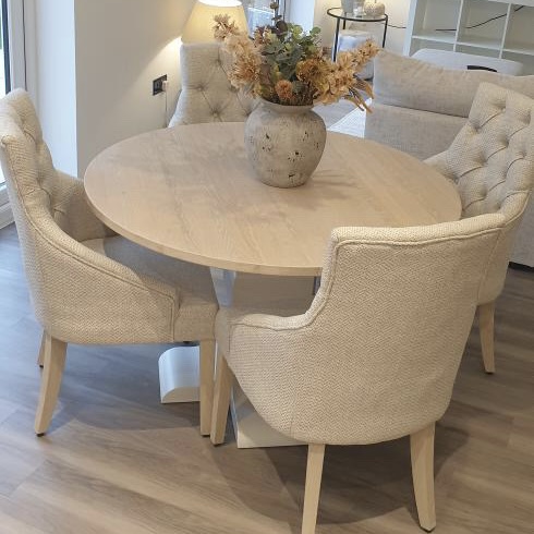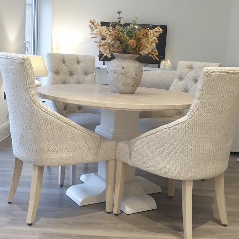 Introducing our exquisite Round Bespoke Trestle Dining Set, a harmonious blend of elegance and craftsmanship that will transform your dining space into a haven of sophistication and comfort. Meticulously designed with a focus on both aesthetics and functionality, this dining set is a testament to the artistry of fine furniture making. This gorgeous example was finished in the timeless neutral combination of F&B Wimbourne White with our Limed Oak top. This dining set also benefits from having 4 of our comfy and luxurious mixed beige winchester fabric dining chairs.