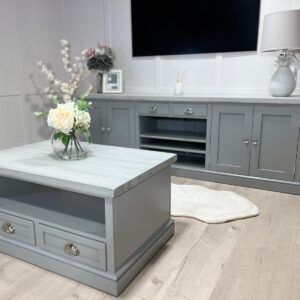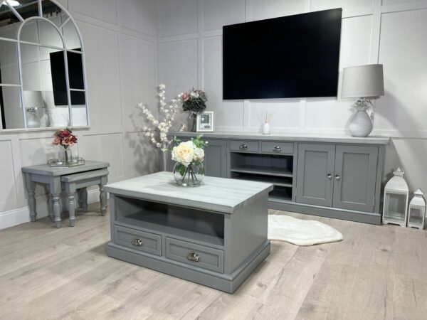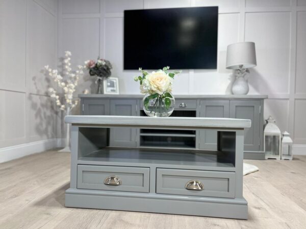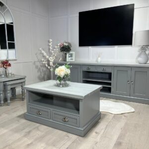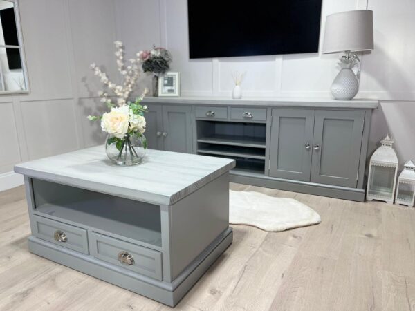 Beautifully crafted shaker style coffee table made from completely solid pine. This product benefits from 2 large draws on one side and decorative dummy draws on the opposite side. The finish shown on the main picture is in manor house grey with our grey wash top.